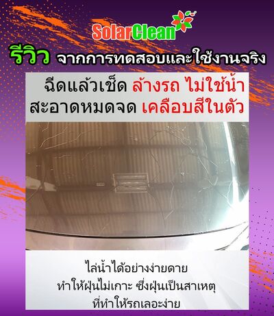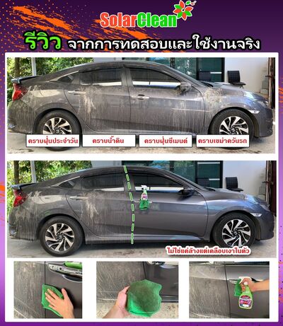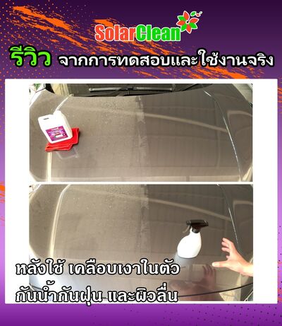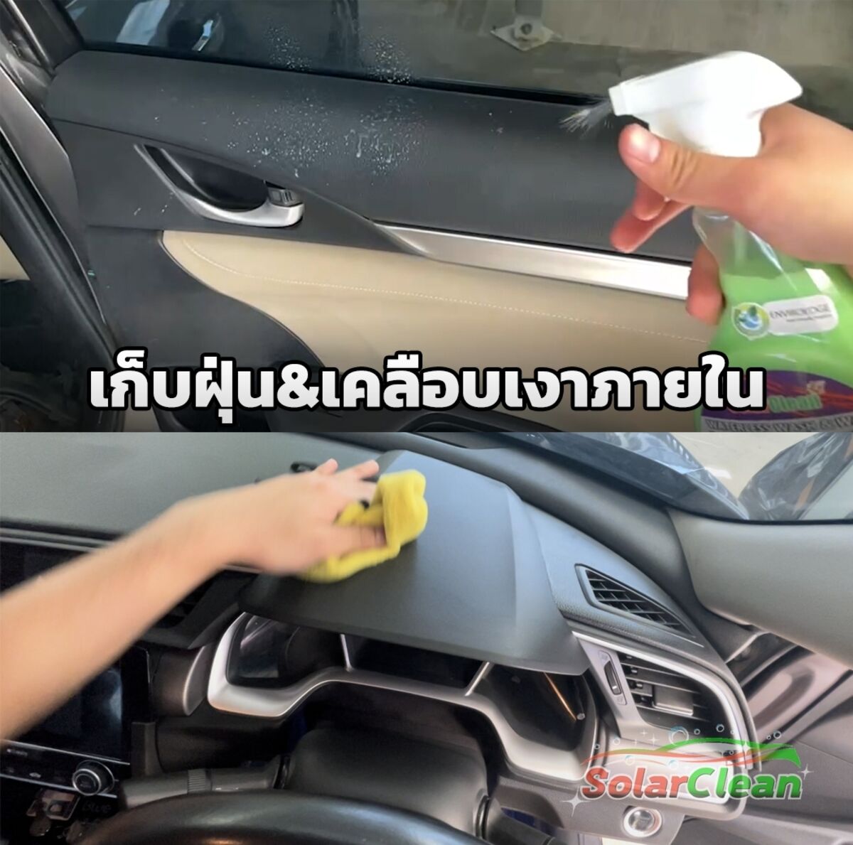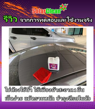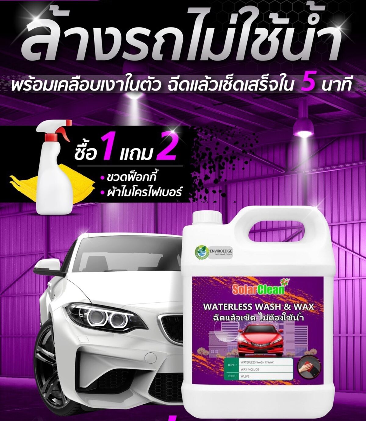 ล้างรถแบบไม่ใช้น้ำ แค่ฉีดแล้วลูบ พร้อมเคลือบเงาในตัว ขนาด 1 ลิตร Waterless SolarCleanSolarClean Waterless น้ำยาล้างรถยนต์และรถมอเตอร์ไซต์แบบไม่ใช้น้ำ ทั้งล้างรถและเคลือบสีในขั้นตอนเดียว คุณสมบัติและประโยชน์ ด้วยนวัตกรรมของ SolarClean Waterless จะทำให้ฝุ่นและคราบสกปรกหลุดออกจาก ตัวรถ และส่วนผสมจากแว๊กซ์จะทำให้รถคุณเงางาม กันน้ำกันฝุ่นได้ ในขั้นตอนเดียว ใช้งานง่าย เพียงแค่ฉีดและเช็ด โดยสามารถใช้งานได้กับทุกส่วนของรถ เช่น ตัวถังรถ ประตู กระจก โครเมี่ย ชิ้นส่วนพลาสติก ล้อแม๊กซ์ ยางรถ เหมาะสำหรับท่านที่อยู่คอนโด หรือจอดรถในที่ไม่สามารถใช้น้ำล้างได้