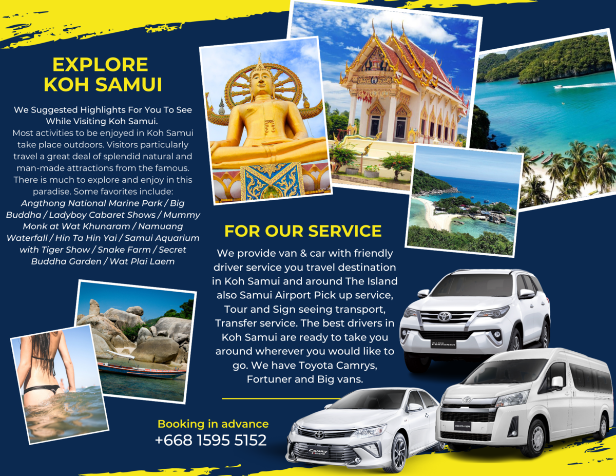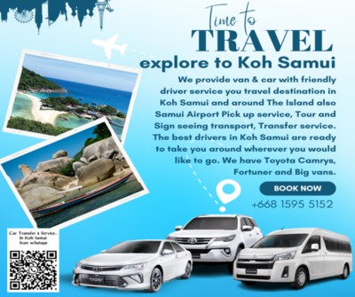Samui transfer MORE Info +669 8454 2447 Shuttle with friendly driver service you travel destination in Koh Samui and around The Island also Shuttle Samui Airport, Samui shuttle service, Samui Tour and sigh seeing Samui transport, Transfer service Samui Airport. Rental with drivers or Self drive car rental in Koh Samui are ready for you go around samui. We have Toyota Camrys, Fortuner and Big vans.Transfer With Driver & Self Drive Car Rental :Our service, you have a driver to act as your personal chauffeur for the day or evening, no matter how many stops you need to make. Our driver arrives at your home at the requested time, ready to chauffeur you in your vehicle wherever you want to go. When you're ready, You and your car will be returned back home safely. Private taxi 4 seats, 7 seats, VIP vans Rent with driver all over Koh Samui, Book in advance to ready for you.Car Transfer Samui Airport & Self Drive Car Rental If you are flying in or out of airports offers convenient transportation. For pickups at the airport, Your driver will already be there waiting as you arrive to show you straight to your car. your driver will meet you inside the terminal holding a name sign. You can always be sure that your driver will be at the airport to pick you up when you arrive. Our car service can of course also be used to travel to the airport.Airport transfer samui, can you drive to koh samui, car for rent koh samui, car rental in koh samui, car rental in samui, car rental koh samui, car rental koh samui airport, car rental samui, car rental samui airport, car service in samui, car service koh samui, car transfer samui, koh samui by car, koh samui car ferry, koh samui car rental, rent a car in samui, homosexual car, Lgbt car, rent car koh samui, samui airport car rental, samui airport transfer, samui car rental, samui cars, samui car for you, samui for you car rental, samui rent car, samui transfer service, samui transport, samui car service, Shuttle in Samui, car hire samui, car hire samui airport, samui car rental airport, samui airport taxi, koh samui airport transfer, samui airport parking, taxi samui airport, car transfer samui, car service samui, rental in samui, rent a car in samui, car rental in koh samui, car rental samui, samui rent car, car for sale koh samui, samui rentals, samui transport, renting a car in koh samui, samui rent a car, self drive car rental samui#carrentalsamuiairport #samuitransferservice #samuitransport #samuicarservice #ShuttleinSamui #Airporttransfersamui #canyoudrivetokohsamui #carforrentkohsamui #samuigaypride #carrentalinkohsamui #carrentalinsamui #carrentalkohsamui #carrentalkohsamuiairport #carrentalsamui #CarforLGBTinsamui #homosexualcar #Lgbtcar #carserviceinsamui #samuigaybeach #carservicekohsamui #cartransfersamui #samuibeachgay #howtogettokohsamuibycar #kohsamuibycar #kohsamuicarferry #kohsamuicarrental #rentacarinsamui #rentcarkohsamui #samuiairportcarrental #samuiairporttransfer #samuicarrental #samuicars #samuicarforyou #samuiforyoucarrental #samuirentcar #Selfdrivecarrental #cheapcarrentalinsamui