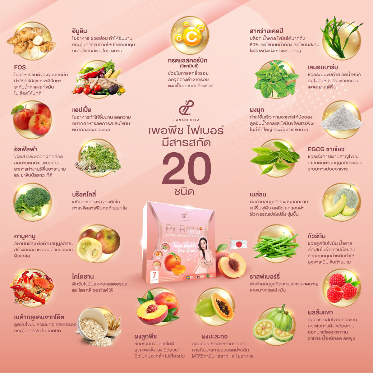 ปนันชิตา เพอร์พีช ไฟเบอร์กระตุ้นการขับถ่าย ไม่ปวดบิดปรับสมดุลลำใส้ และระบบขับถ่ายพุงยุบหน้าท้องแบนราบยับยั้งเอ็นไซด์ ที่เปลี่ยนแป้งเป็นน้ำตาลผิวพรรณสดใส ออร่าวิธีใช้ : ชงในน้ำเย็น 150 มล. ทานก่อนนอนวันละ 1 ซอง1 กล่องมี 7 ซอง อย.13-1-15859-5-0686