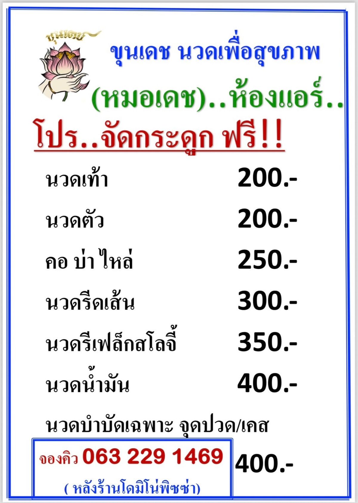 ร้านขุนเดช นวดเพื่อสุขภาพ (Khundet Massage Nonthaburi) นวดบำบัด นวดผ่อนคลาย ครบวงจร ปรับสมดุล ที่ห้างฯ เมเจอร์ ปากเกร็ด นนทบุรี ชั้น 1 (หลังร้านโดมิโน่พิชซ่า) ห้องแอร์ - นวดแผนไทยนนทบุรี ประสบการณ์กว่า 30 ปี