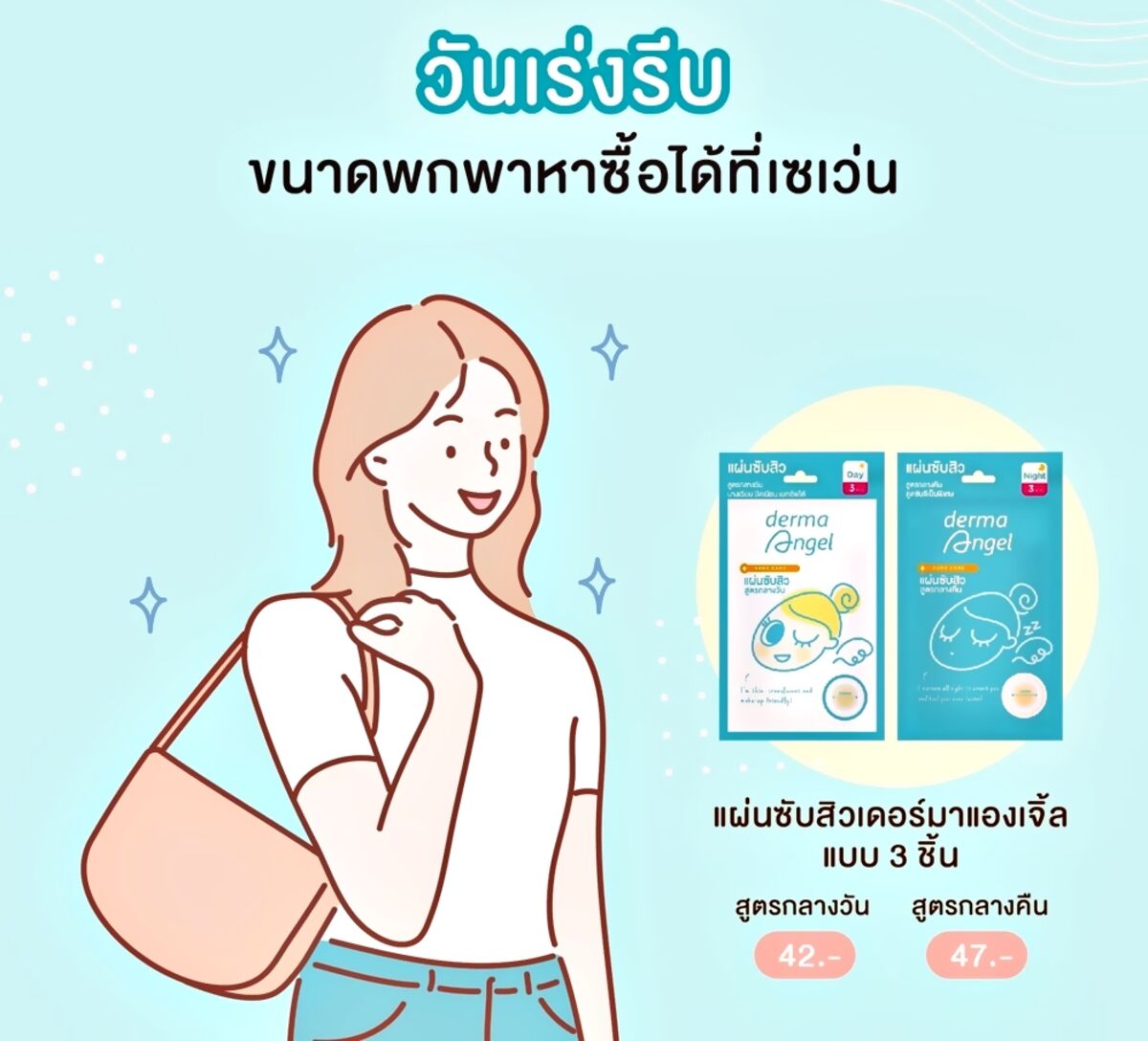 ในปัจจุบันแผ่นแปะสิวมีให้เลือกหลากหลายแบรนด์ Derma Angel เป็นหนึ่งในแบรนด์แผ่นแปะสิวที่มีประสิทธิภาพในการดูดซับของเหลวได้ดี แต่บางเบาสามารถแต่งหน้าทับได้ มี 2 สูตรในเซเว่นอีเลฟเว่นทุกสาขา คือ สูตรกลางวัน (Day) และสูตรกลางคืน (Night)... ไม่ว่าจะอากาศแบบไหน แค่ดูแลให้ทัน สิวก็แพ้เราได้ทุกฤดู