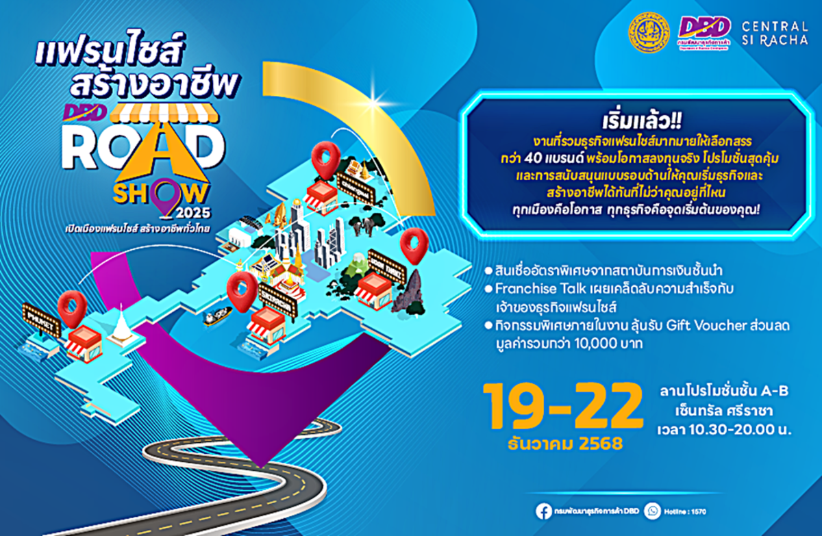 กรมพัฒนาธุรกิจการค้า เชิญชวนเที่ยวงาน แฟรนไชส์สร้างอาชีพ Roadshow 2025 วันที่ 19 ถึง 22 ธันวาคม 68